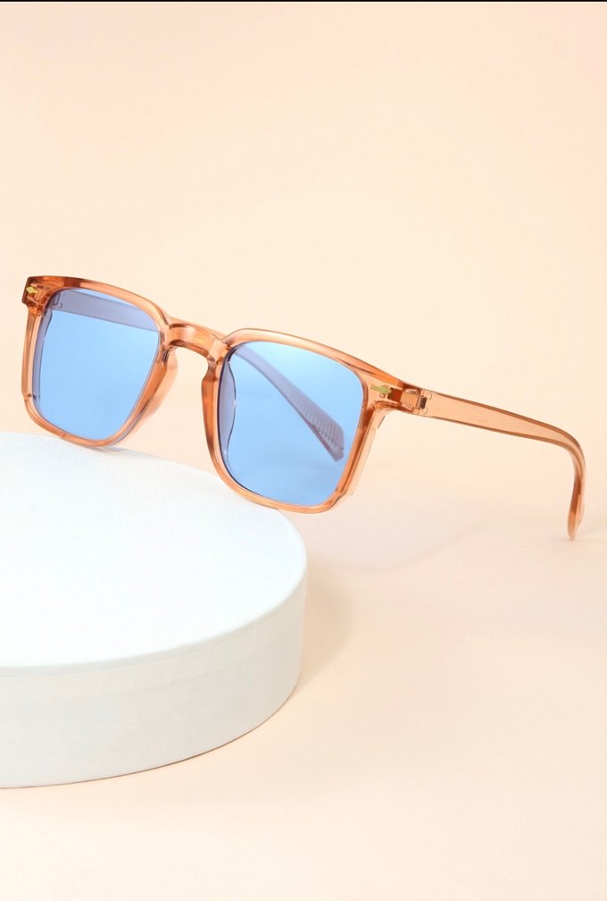 Pastel mavi camlı, turuncu çerçeveli kadın güneş gözlüğü. Minimalist, retro ve pop kültür tarzında, bohem ve hippie görünüme uygundur. ️
