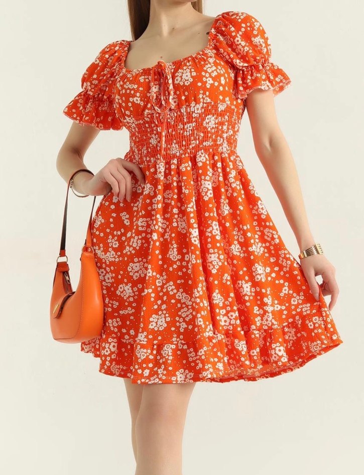 Turuncu Çiçek Desenli Gipeli Mini Elbise