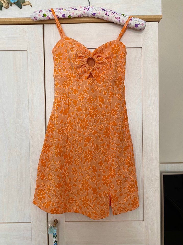 Koton marka, İnce askılı ve çiçek desenli turuncu renk mini elbise. Tam yazlık bir elbise, esnek kumaş. Hiç kullanılmadı, herhangi bir sorunu yoktur.