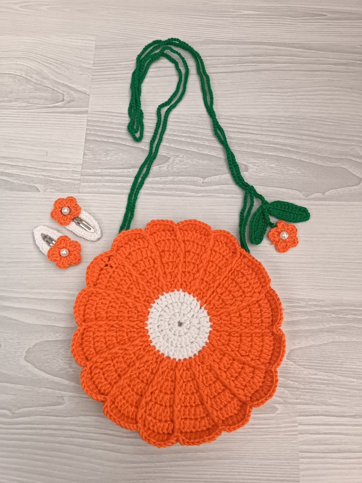 Turuncu Çiçek Desenli Örgü Çanta ve Toka Seti