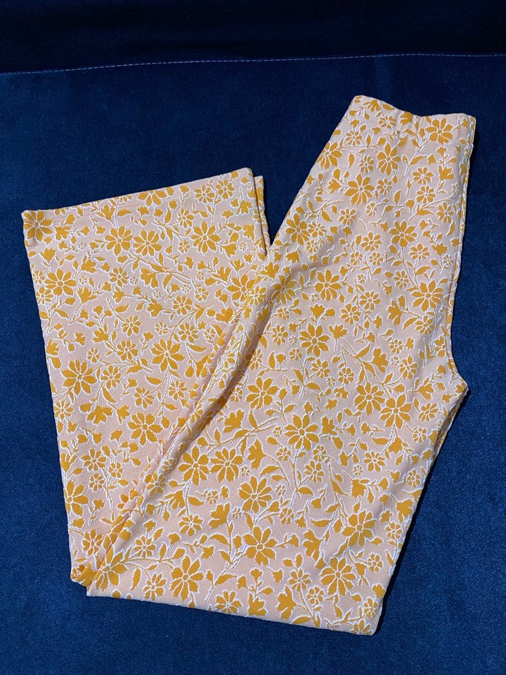 Pastel turuncu çiçek desenli, kabartma detaylı, regular fit bohem tarz pantolon.