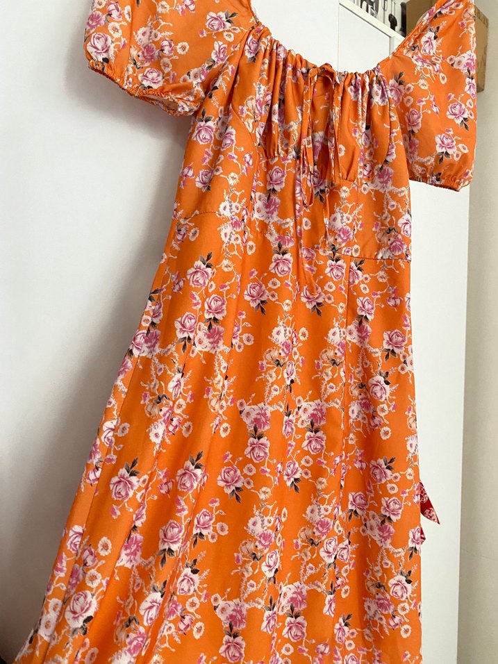 Turuncu çiçek desenli, sentetik kumaştan uzun ve bol kesim elbise. Fotoğraftan daha soft bir turuncusu var kameradan dolayı rengi bu şekilde çıkıyor. Sadece 2 kez giyildi hiçbir kusuru yok yeni gibi ayrıca astarı da mevcuttur.