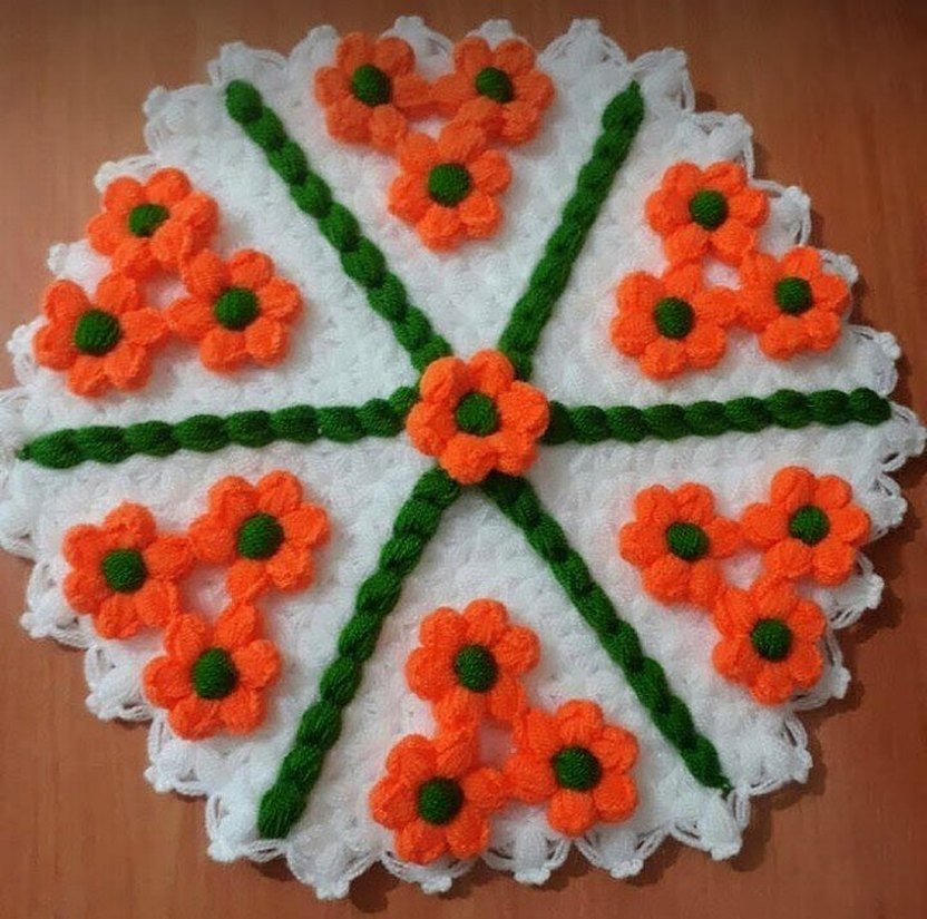Yumuşak iplikten yapılmış, beyaz zemin üzerinde turuncu çiçekler ve yeşil saplar bulunan el örgüsü