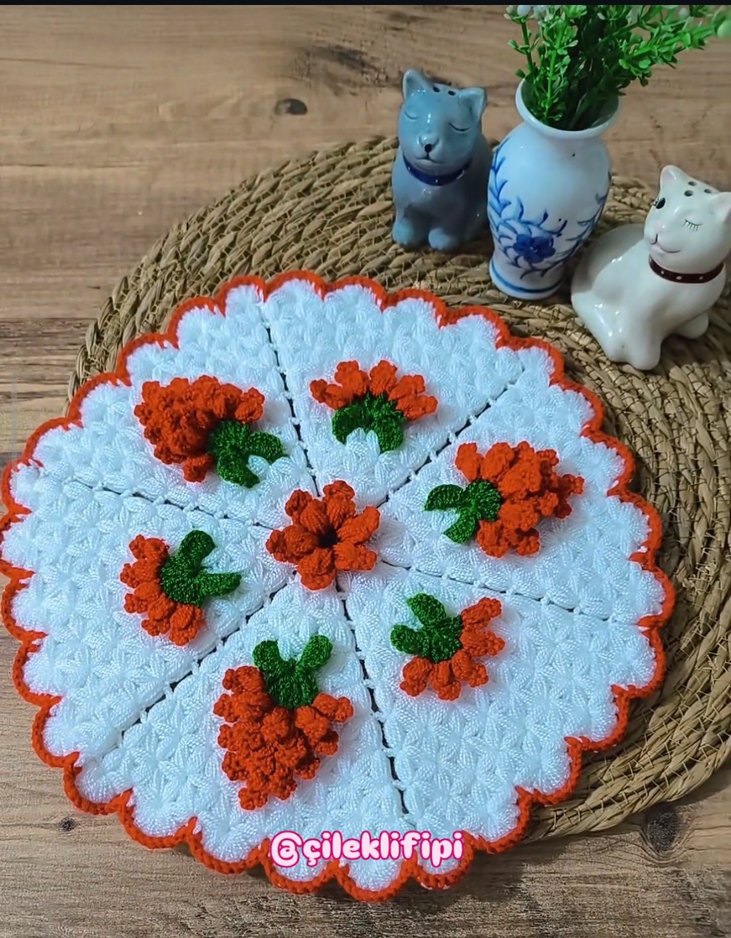 kırmızı çiçek desenli beyaz tabanlı, kenarları dalgalı el örgüsü yuvarlak lif