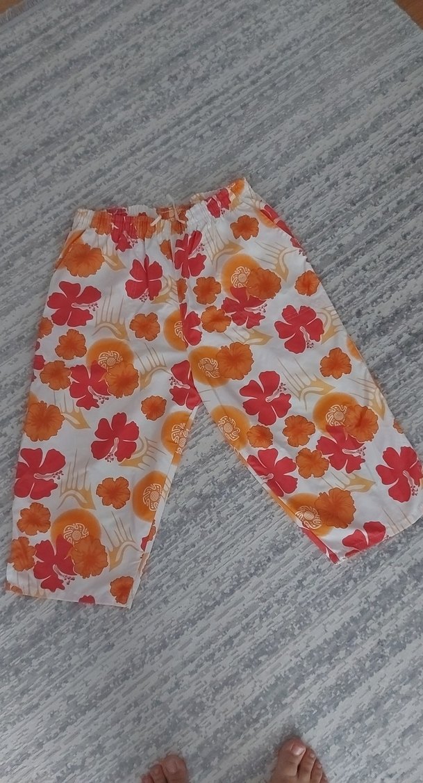 Rahat kesim, kısa boy, turuncu ve kırmızı çiçek desenli piliseli kadın pantolonu, yumuşak sentetik kumaştan, günlük sokak stili için uygundur. Kapri deniz için de uygundur.