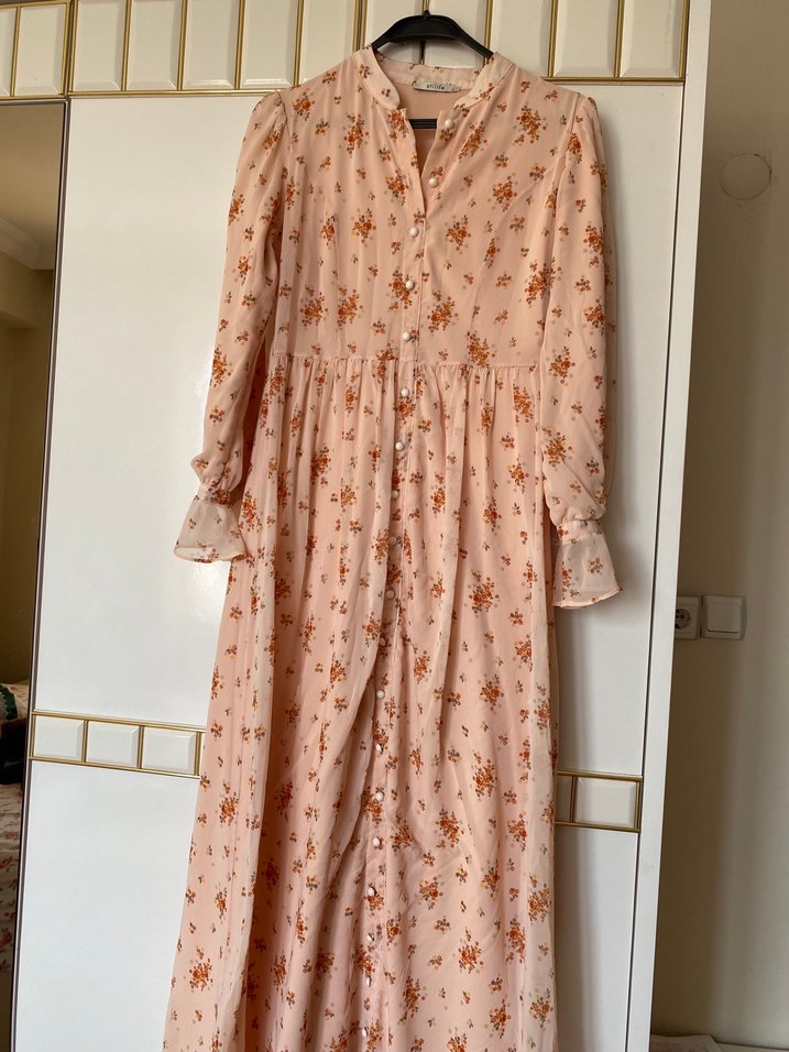 Turuncu renkte, uzun kollu ve V yakalı, düğmeli ön detaylı, bol kesim, çiçek desenli uzun bohem elbise.
