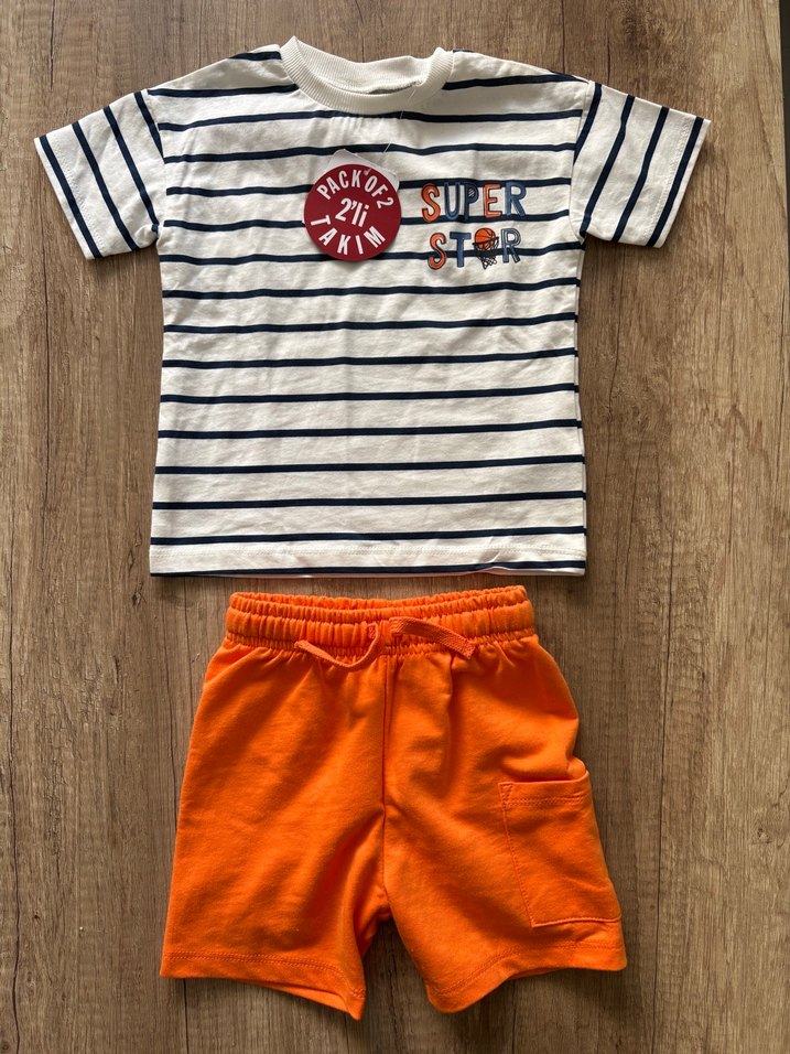 Pamuklu bebek erkek takımı, kısa kollu çizgili tişört ve renkli turuncu şort içerir. Yuvarlak yaka ve düğme detaylıdır.