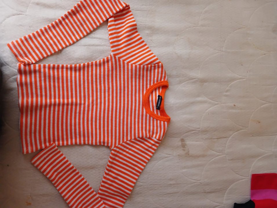 Turuncu ve beyaz çizgili, uzun kollu ve yuvarlak yakalı renkli çocuk içliği. Rahat bir kullanım sağlar.