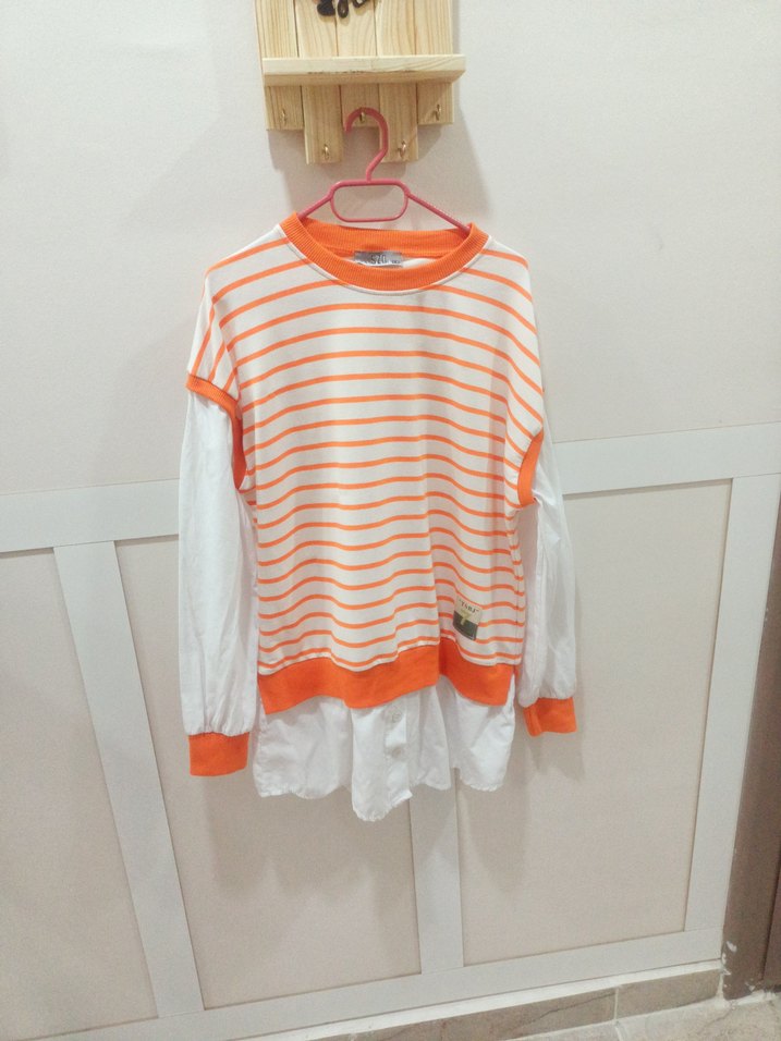 Kadınlar için uzun kollu, bol kesim ve yuvarlak yakalı gömlek. Yumuşak pamuktan, turuncu-beyaz çizgili ve katmanlı görünümlü, günlük rahat kullanım için uygundur.