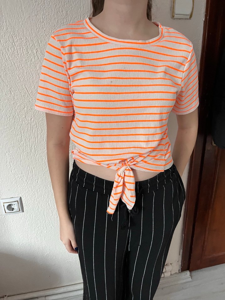 Bu dar kesim kadın tişörtü, bisiklet yaka ve kısa kolludur. Açık turuncu çizgiler, pileli detay ve ön bağlama özelliğiyle günlük kullanıma uygundur.