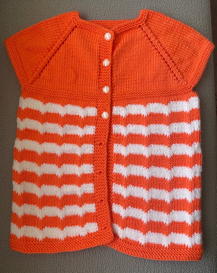 Turuncu ve beyaz çizgili, düğmeli, örgü kız yeleği. Kolsuz ve vücuda oturan kesimiyle rahat kullanılır. El emeği örgü 4 yaşa kadar olur istenilen renk ve ölçüde sipariş alınır