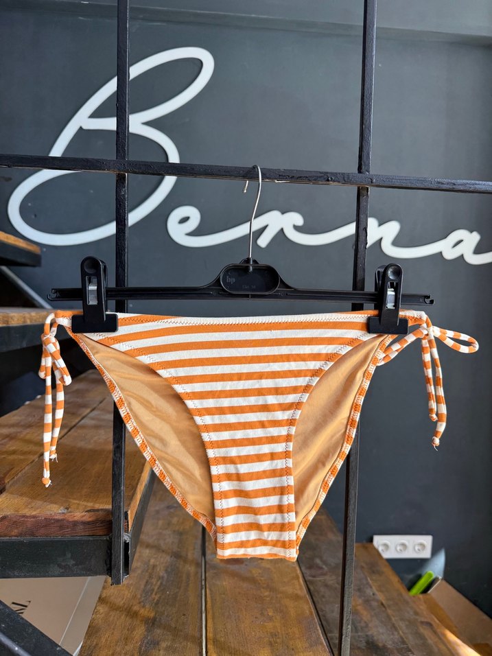 Turuncu ve beyaz çizgili, yanları bağlamalı, fit kesim mini bikini altı. Bohem ve athleisure tarzı ile plajda kullanıma uygun.