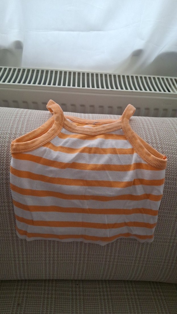 Bu dar kesim, askılı cocuk atlet, pastel turuncu ve beyaz çizgilerle örme dokudadır. Yumuşak sentetik kumaştan kısa boylu, günlük sokak stiline uygun.