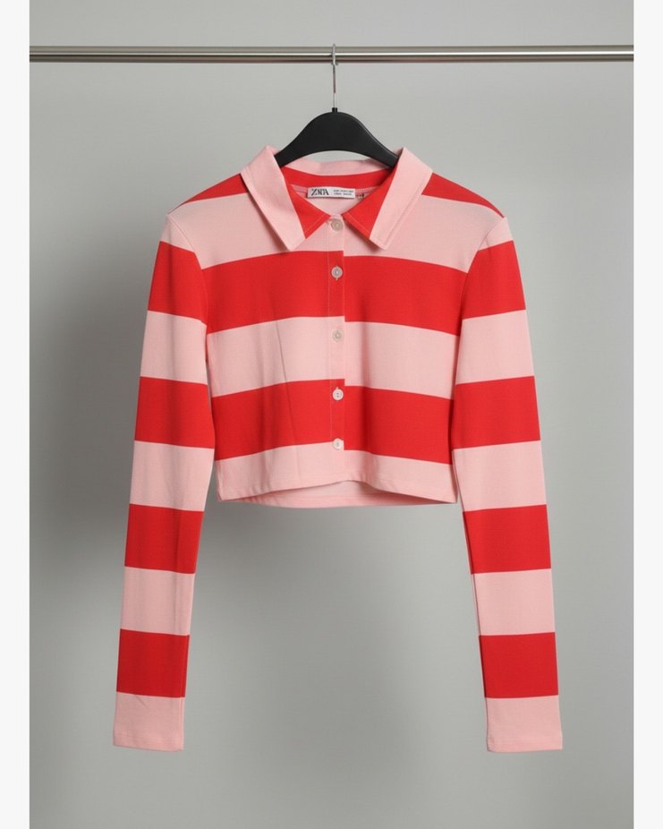Turuncu pudra pembe çizgili, uzun kollu, düğmeli ve yakalı kadın kazak. Vücuda oturan kesimi ve midi boyu ile günlük kullanım için uygundur.