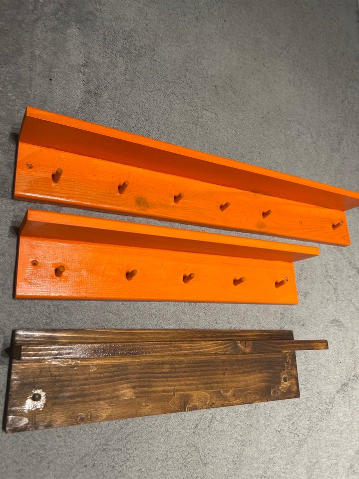 Koyu turuncu renkte, çocuklar için askılı ahşap raflar. Dayanıklı ve basit tasarıma sahiptir.