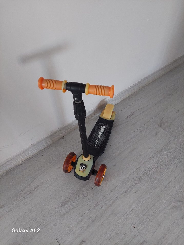 Turuncu renkli tutacaklara ve tekerleklere sahip koyu renk çocuk scooterı. Dengeli sürüş için üç tekerlekli ve sağlam ayak tahtası bulunur. Boy ayarlanabilen,ışıklı ve kusursuz.