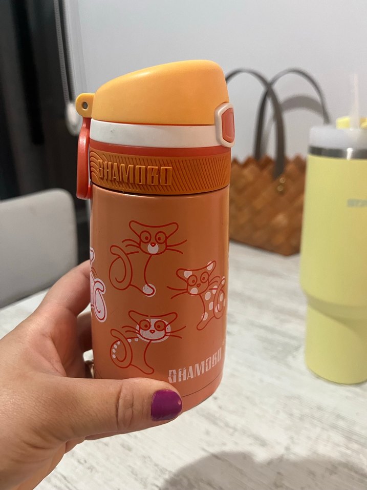 Turuncu renkli, güvenli kapaklı çocuk termosu, sevimli hayvan desenleriyle sıcak veya soğuk içecekler için uygundur. Ürünün kusuru yoktur ğipeti dahi sapasağlamdır altı makinada yıkandığı için açıldı rengi