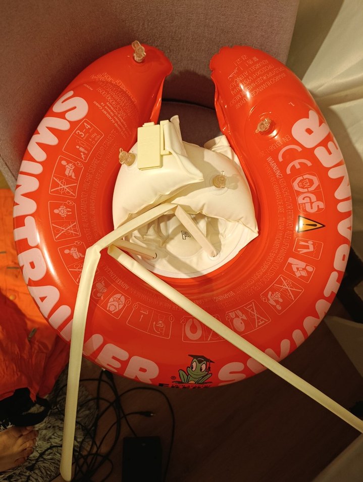 Turuncu şişme çocuk yüzme simidi, güvenli oturma yeri ve bacak delikleri ile donatılmıştır. Küçük yüzücüler için eğlenceli ve güvenlidir. ️az kullanılmış 3 ay - 4 yaş