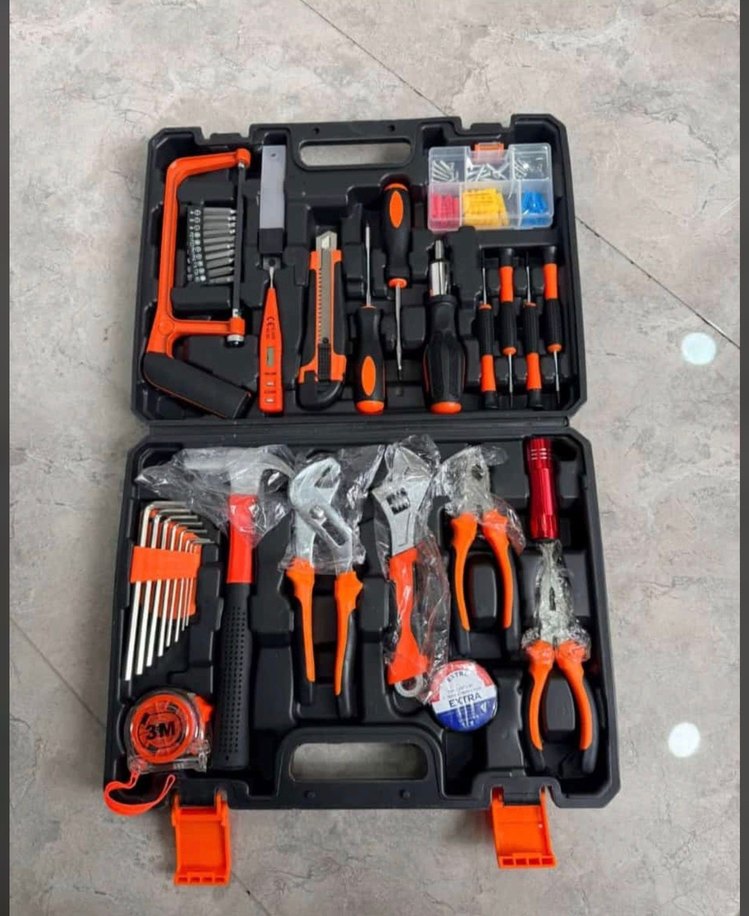 Çeşitli pense, tornavida, çekiç, mezura ve diğer temel aletleri içeren turuncu çok amaçlı el aletleri seti, sağlam bir kutuda düzenlenmiştir. ️