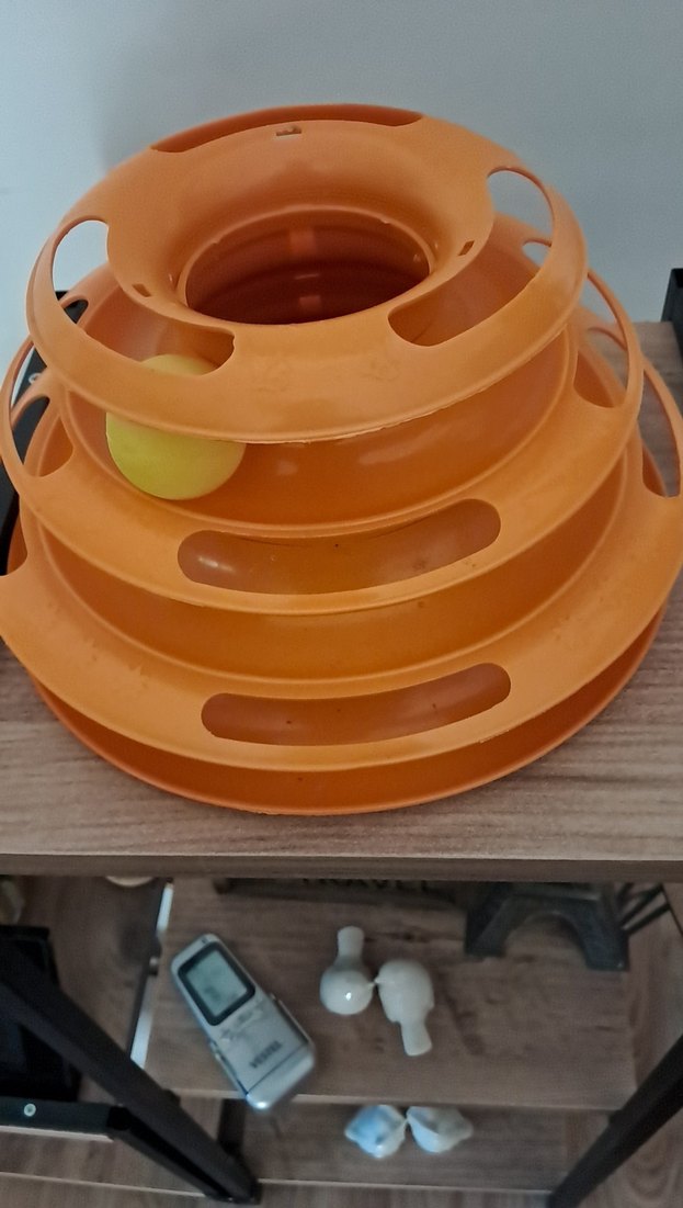 Renkli turuncu kedi oyuncağı, içinde top bulunan çok katmanlı halkalarla etkileşimli oyun sağlar. Kediniz için hareket ve eğlence teşvik eder.