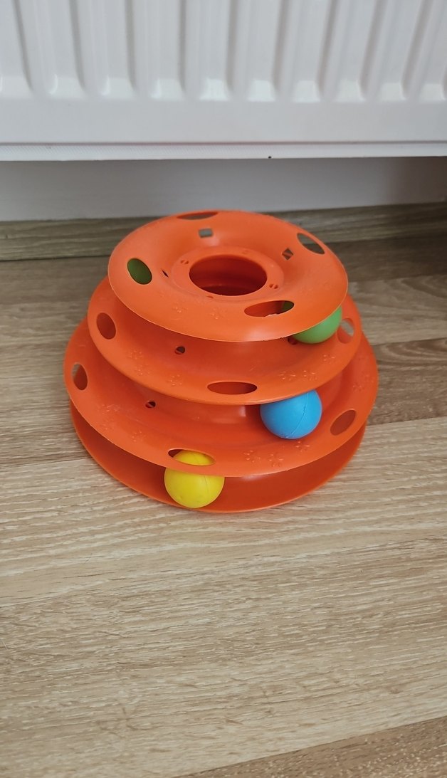 Turuncu renkte, çok katmanlı ve içindeki toplarla hareketli kedi oyuncağıdır.