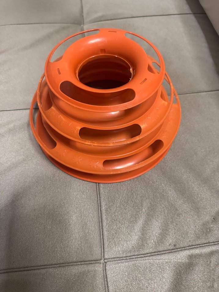 Canlı turuncu renkte, çok katmanlı ve delikli kedi oyuncağıdır. Kediler için eğlenceli ve uyarıcı bir aksesuar.