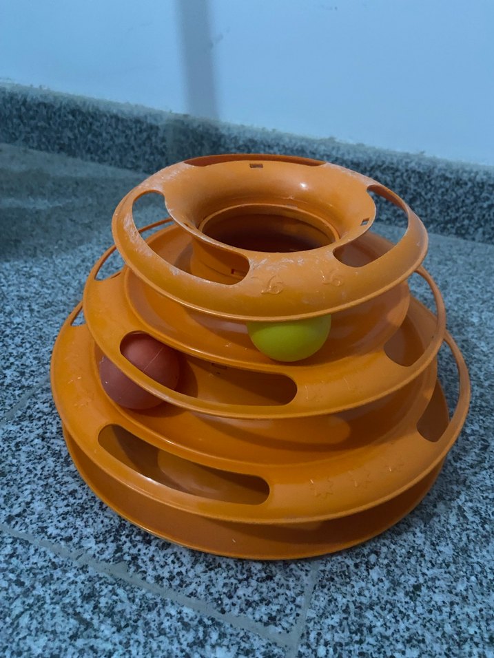 Turuncu renkte, hareketli toplarla çok katmanlı kedi oyuncağıdır. Kedilerin ilgisini çeker ve eğlence sağlar.