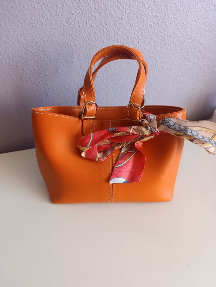 Turuncu deri, tokalı ve baskılı fular detaylı bohem kadın çantası, günlük kullanıma uygun.