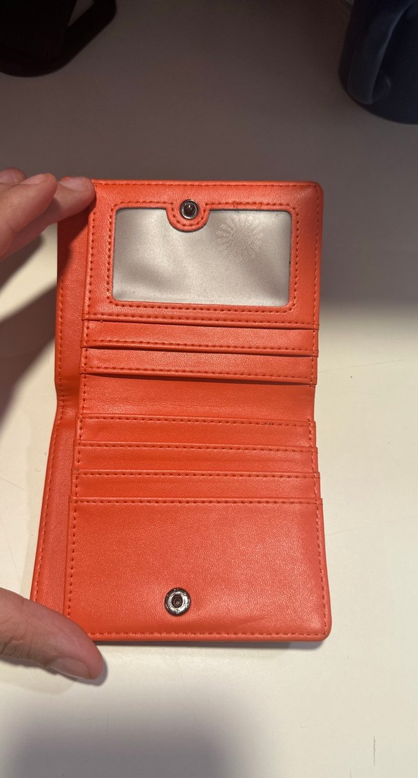 Turuncu deri erkek cüzdanı, tokalı kapama ve çoklu kart yuvalarına sahip. Parlak yüzeyi ve desenli tasarımı, günlük kullanıma uygun trend bir stil sunar.