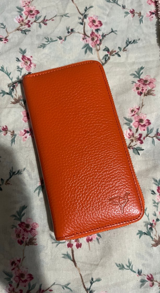 Turuncu deri kadın cüzdanı, fermuarlı kapanışa ve desen içermeyen pürüzsüz yüzeye sahiptir. Canlı rengi ve klasik Paris tarzıyla günlük kullanım için uygundur.