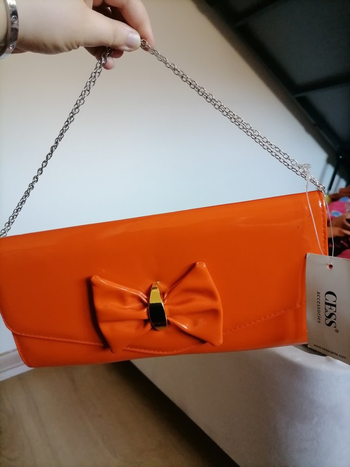 Turuncu deri ve fiyonk detayıyla kadın çanta, zincir askılı, modern klasik ve göz alıcı tarzda günlük kullanım için uygun.