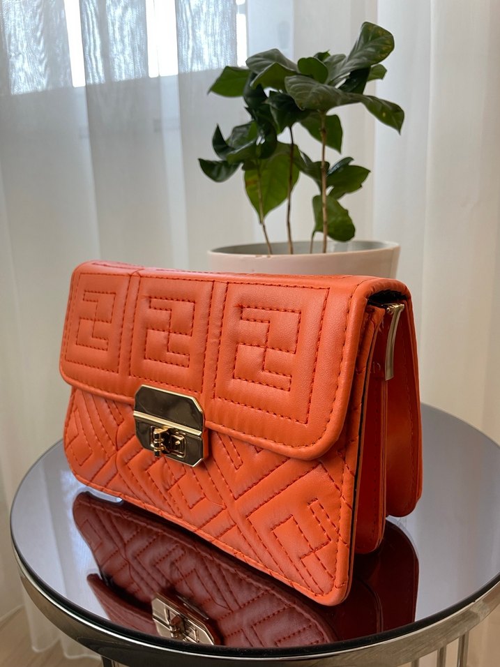 Turuncu renkli, baskılı deri kadın çanta, tokalı kapama detayına sahip. Günlük kullanım için modern klasik tarzda şık bir seçenek.