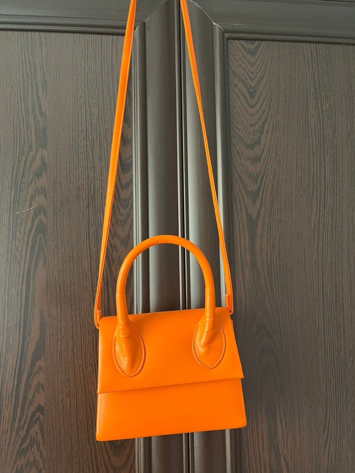 Parlak turuncu deri kadın çanta, tokalı kapak ve minimal tasarıma sahip. Saplı ve askılı, günlük kullanım için cesur ve çağdaş tarzda.