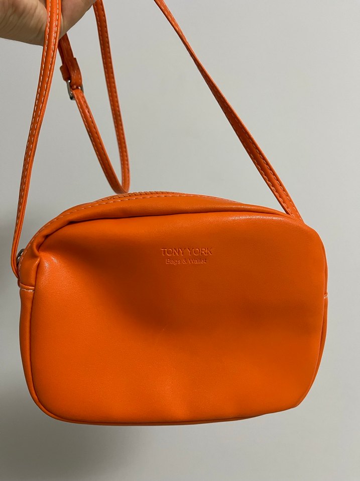 Turuncu deri çapraz çanta, fermuarlı ve sade tasarımlı, günlük sokak stili için uygundur. TONYYORR marka yazısı önünde yer alır. Yeni gibi bikaç kere kullandım