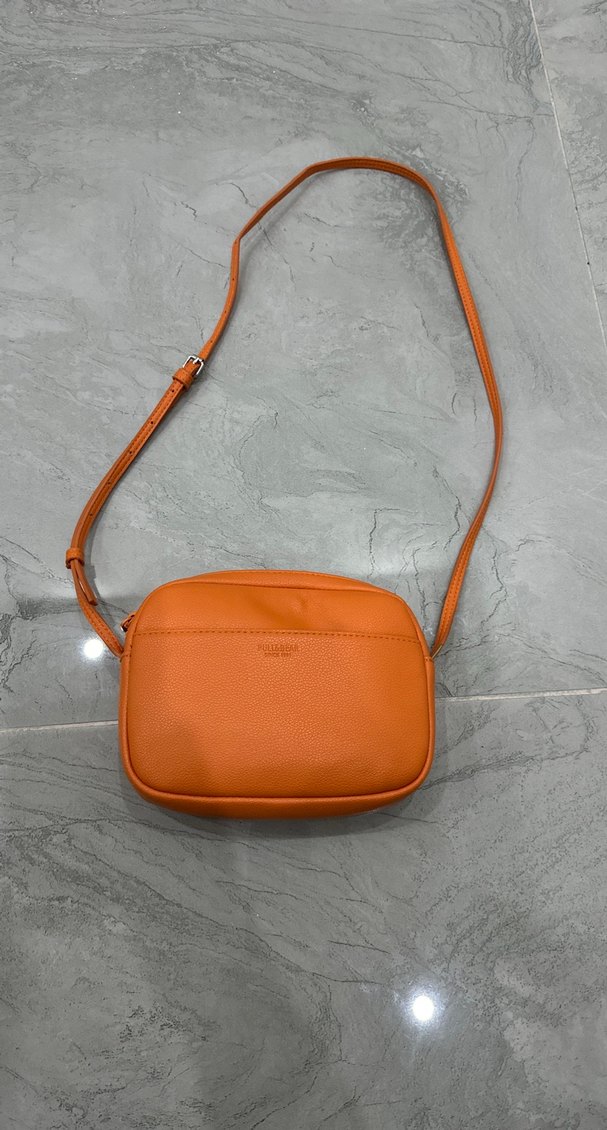 Turuncu deri çapraz çanta, kemerli askısı ve minimalist desensiz tasarımıyla günlük sokak stiline uygun pastel tonlarda sade bir modeldir.