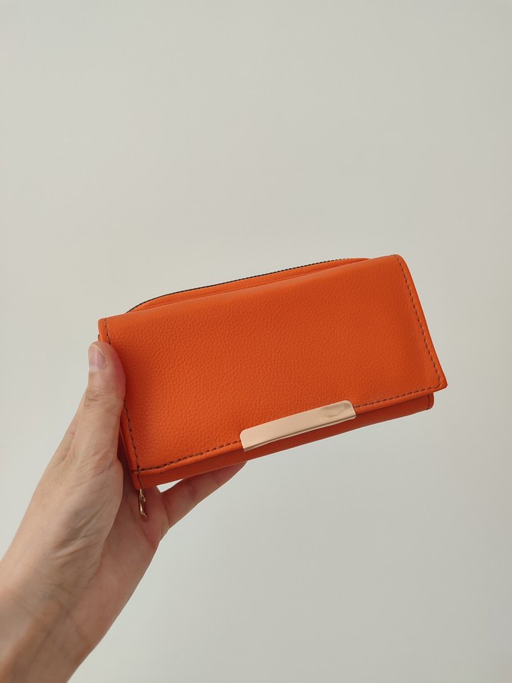Minimalist turuncu deri kadın portföy cüzdan, fermuarlı kapanış ve sade tasarıma sahiptir, günlük kullanım için uygundur. Görselin sonuna aldığım fiyatı ekledim. Hiç kullanılmadı