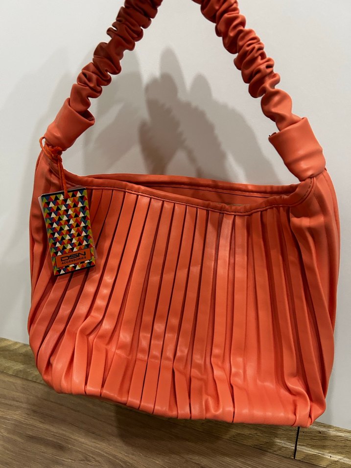 Parlak turuncu deri pilili ve nakışlı desenli, bohem ve avangart tarzda kadın çantası. Buruşuk saplı, günlük kullanıma uygun.