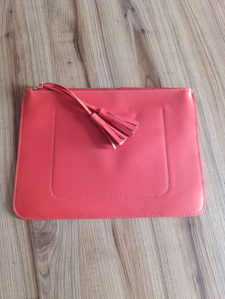 Turuncu deri portföy çanta, püskül detayı ve minimalist tasarıma sahiptir. Günlük kullanıma uygun, renkli ve çağdaş bir görünüme sahiptir.