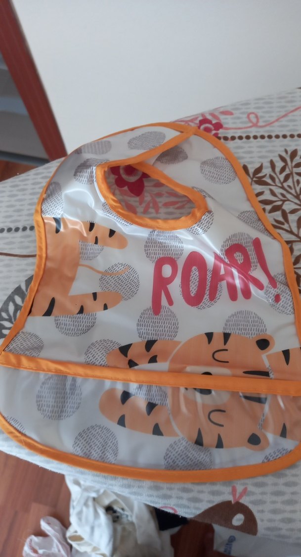 Turuncu kenarlıklı, kaplan desenli ve "ROAR!" yazılı renkli bebek önlüğü. Kullanışlı cep içerir.