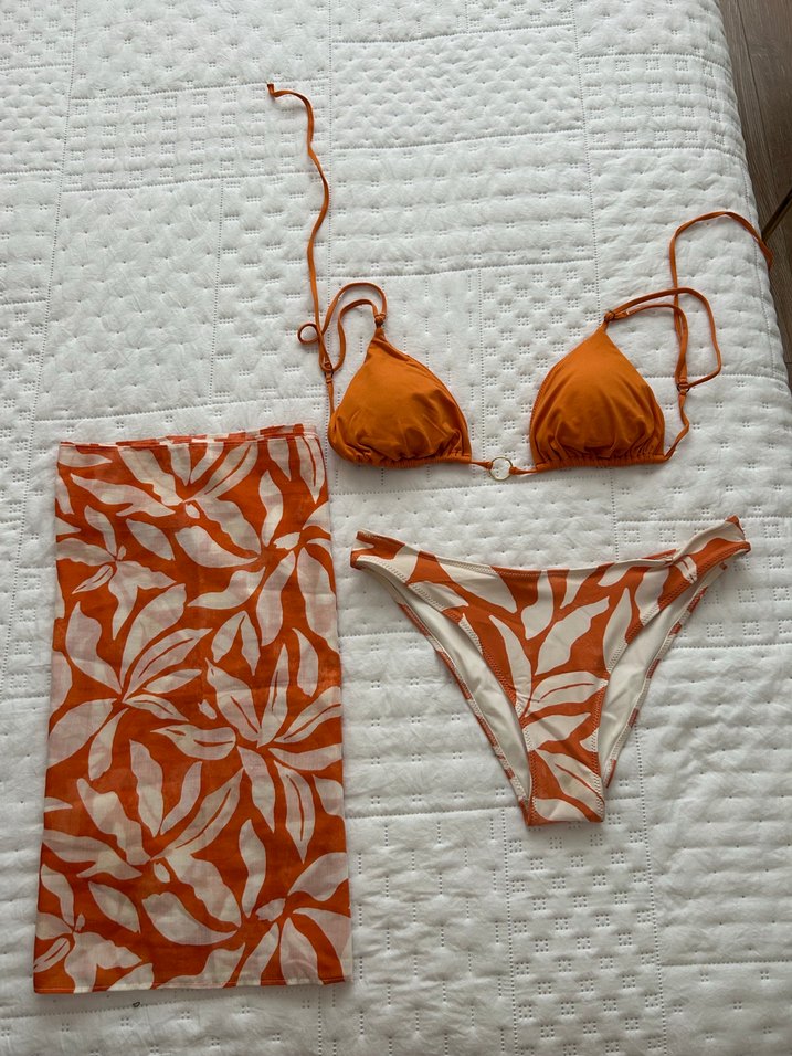 Turuncu deseniyle bohem tarzda, askılı üst ve mini alt parçadan oluşan, drapeli pareo ile tamamlanan kısa kesim bikini takımı.