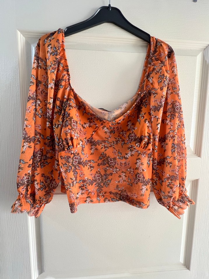Turuncu renkte, salaş kesim ve drapeli tekne yakalı, uzun kollu, çiçek desenli bohem tarzda kısa bluz. Sadece göğüs kısmında astar var.