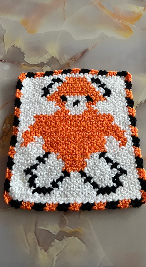 Turuncu, beyaz ve siyah desenlere sahip el örgüsü, renkli ve yumuşak dokulu banyo süngeri.