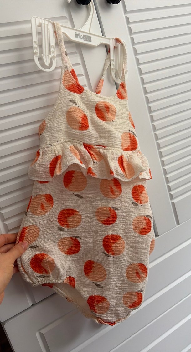 Pastel turuncu desenli, bel kısmında fırfırlı ve ayarlanabilir askılı bebek tulumu. Yumuşak dokulu kumaştan yapılmıştır.