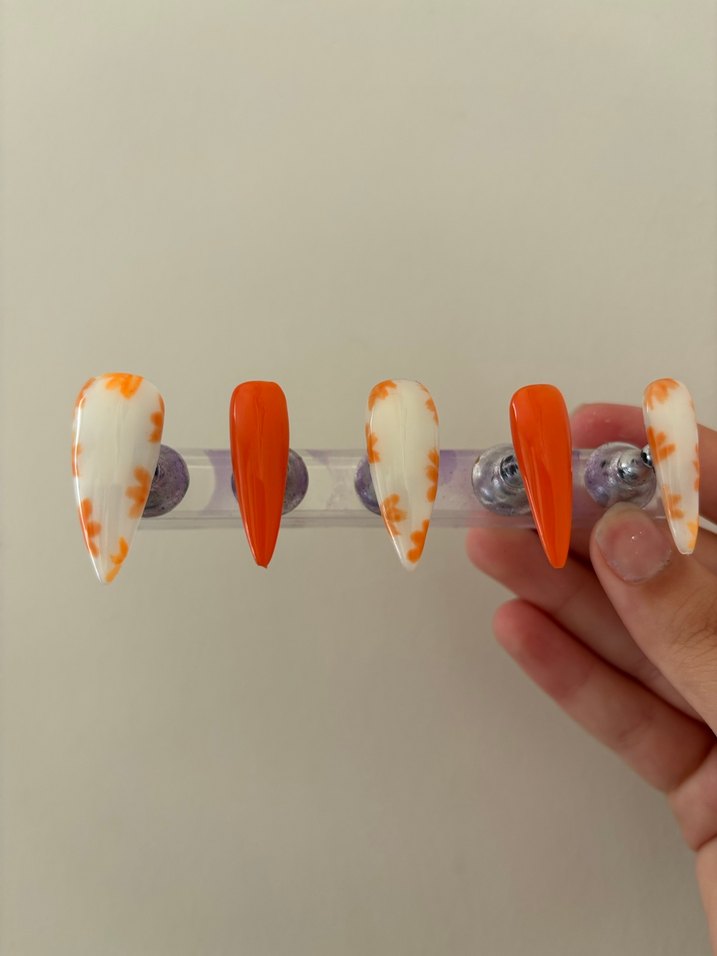 Turuncu renkli, desenli ve düz modellerden oluşan tırnak süsleri seti. Yeni nesil tips üzerine jel uygulanarak kalıcı oje ile renklendirilmiştir. Ölçülerinize özel olarak hazırlanacaktır. Paket içerisinde portakal çubuğu, mini törpü ve tüysüz mendil mevcuttur. Sıvı yapıştırıcı +60₺. Ortalama 1 gün içerisinde kargoya teslim edilir