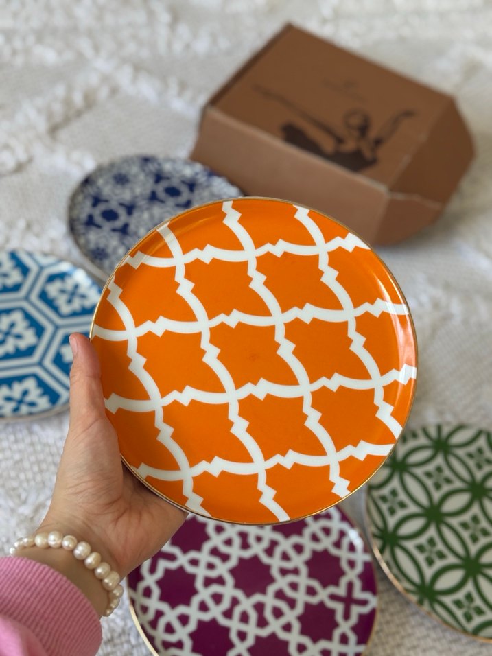 Canlı turuncu zemin üzerine beyaz geometrik desenli renkli tabak, yiyecek sunumu veya saklama için uygundur.Porland morocco serisi
