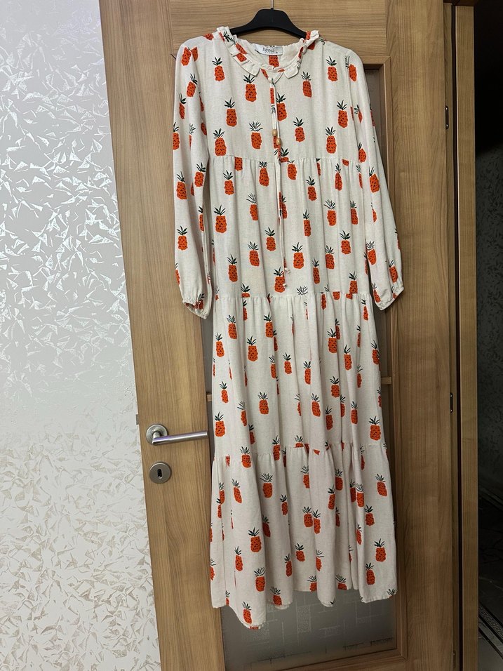 Yüksek yakalı, düğmeli önlü, uzun kollu, turuncu desenli, bol kesim bohem uzun elbise. Hafif sentetik kumaştan üretilmiştir.