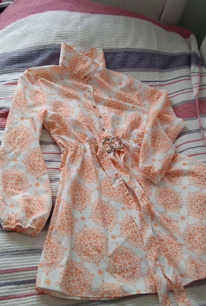 Turuncu pastel desenli, düğmeli, uzun kollu, yakalı ve bol kesim hamile tunik. Günlük kullanım için uygundur.