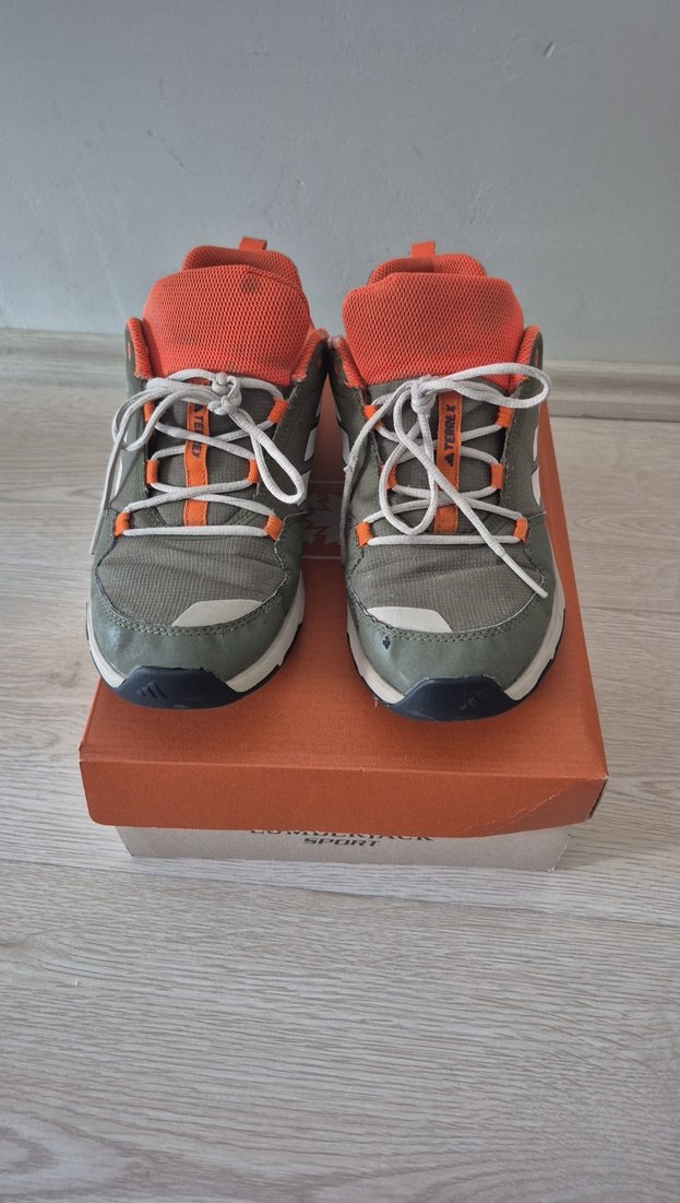 Turuncu ve haki renklerde adidas terrex , baskılı desenli erkek çocuk spor ayakkabısı. Kauçuk tabanlı ve cırt cırtlı, sokak stili için uygun. fotografta görüldüğü gibidir orjinaldir.
