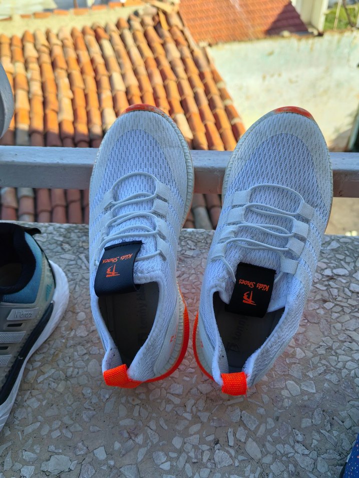 Gri ve turuncu renkli, bağcıklı ve kauçuk tabanlı spor ayakkabılar. Erkek çocuk rahat ve trend sokak stili ayakkabılar.