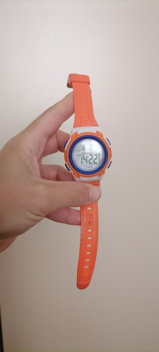 Turuncu kayışlı dijital erkek spor saati, zaman ve ek ikonları gösterir. Sokak stili spor tasarımı ile aktif kullanıma uygundur. ⌚